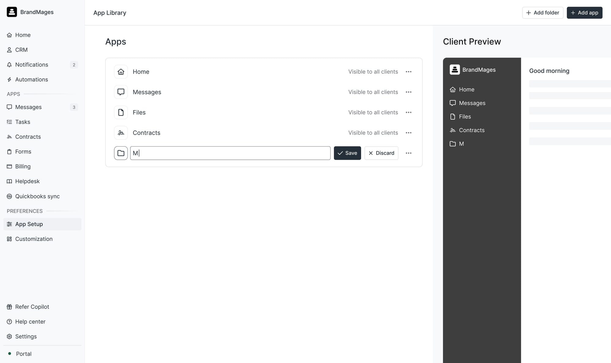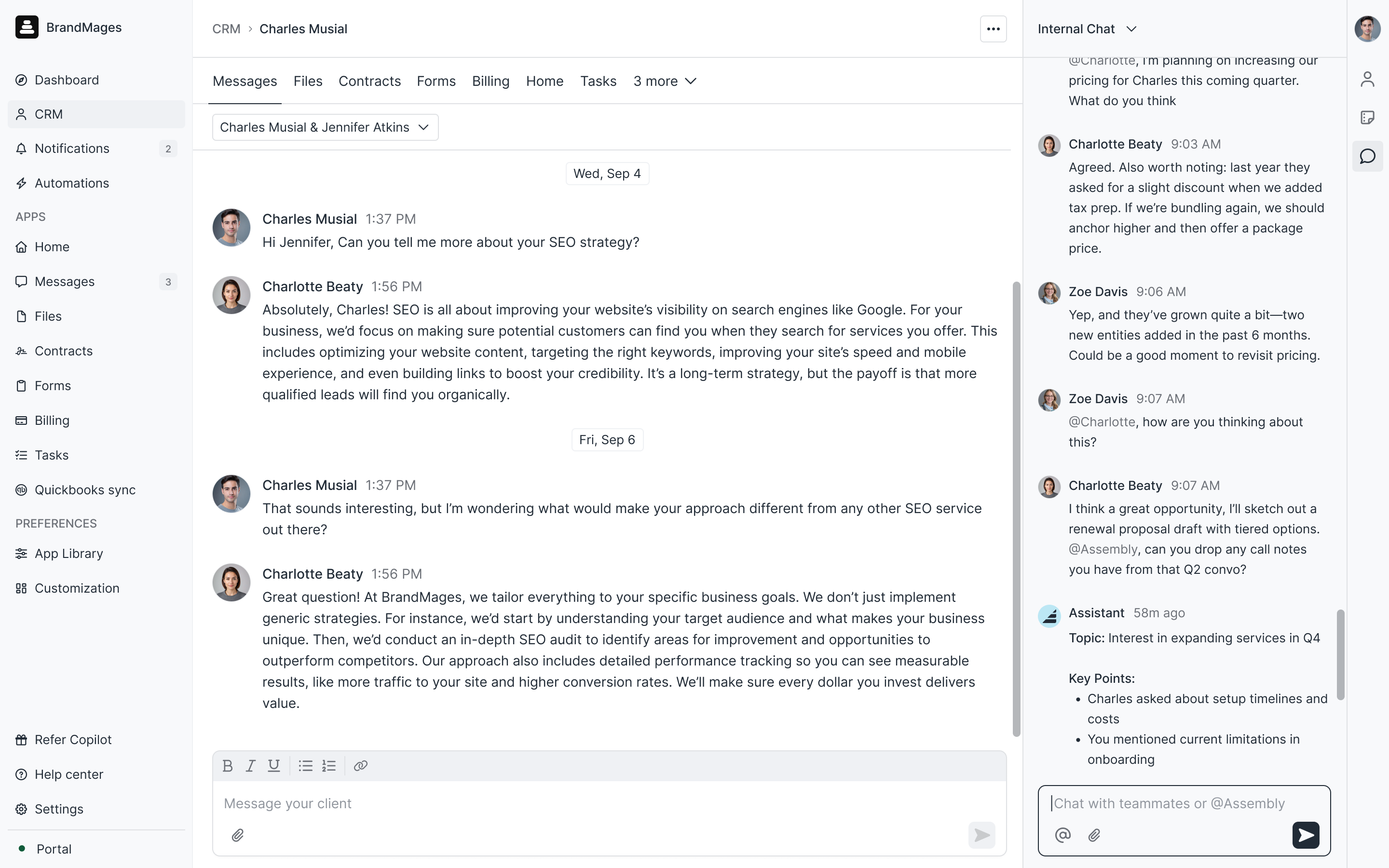 We've redesigned the right sidebar on your client details in the CRM —and brought it to more surfaces. Now when you're in Messages, Files, Notifications, or other apps looking at client-specific content, you can pull up the context bar to see client details, edit custom fields, add internal notes, or chat with your team—without navigating away. The goal: show you the right context at the moment you need it, so you're not constantly clicking back to the CRM.