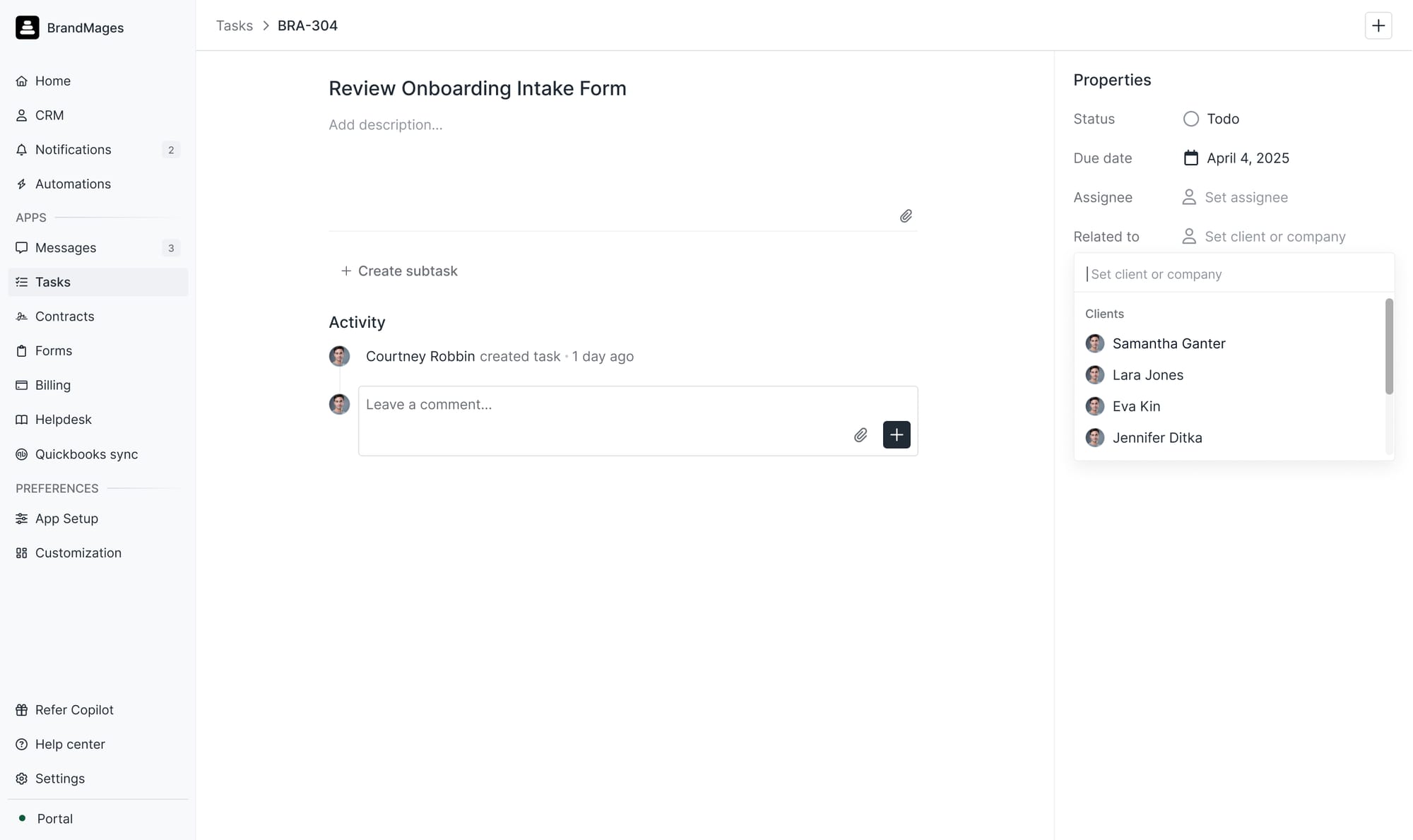 You've asked for this one a lot: the ability to associate a task with a client or company without making it visible to them. Now you can create a task, associate it to a client, and it shows up on that client's profile — but only your team sees it. When you're ready, you can optionally share it with the client. This is huge for teams who want a single view of everything happening with a client, without cluttering the client's task list.