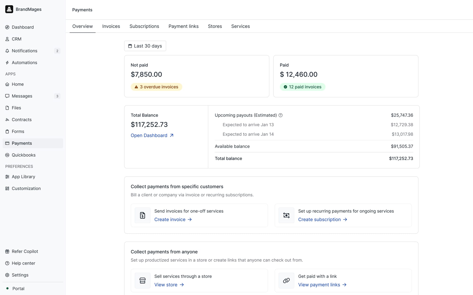 We've consolidated all billing surfaces into a single page with tabs: Overview, Invoices, Subscriptions, Payment Links, Stores, and Services. The new Overview tab shows first-time users a clear path to their first payment, while active users see their balance, upcoming payouts, and payment activity at a glance.