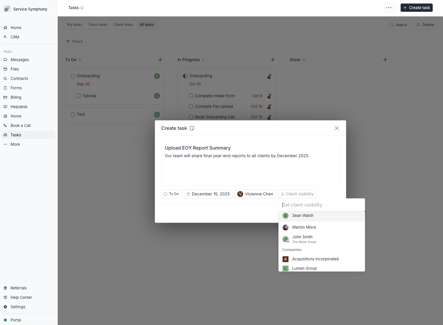 You've asked for this one a lot: the ability to associate a task with a client or company without making it visible to them. Create a task, associate it to a client, and it shows up on that client's profile — but only your team sees it. When you're ready, you can optionally share it with the client. This is huge for teams who want a single view of everything happening with a client, without cluttering the client's task list.