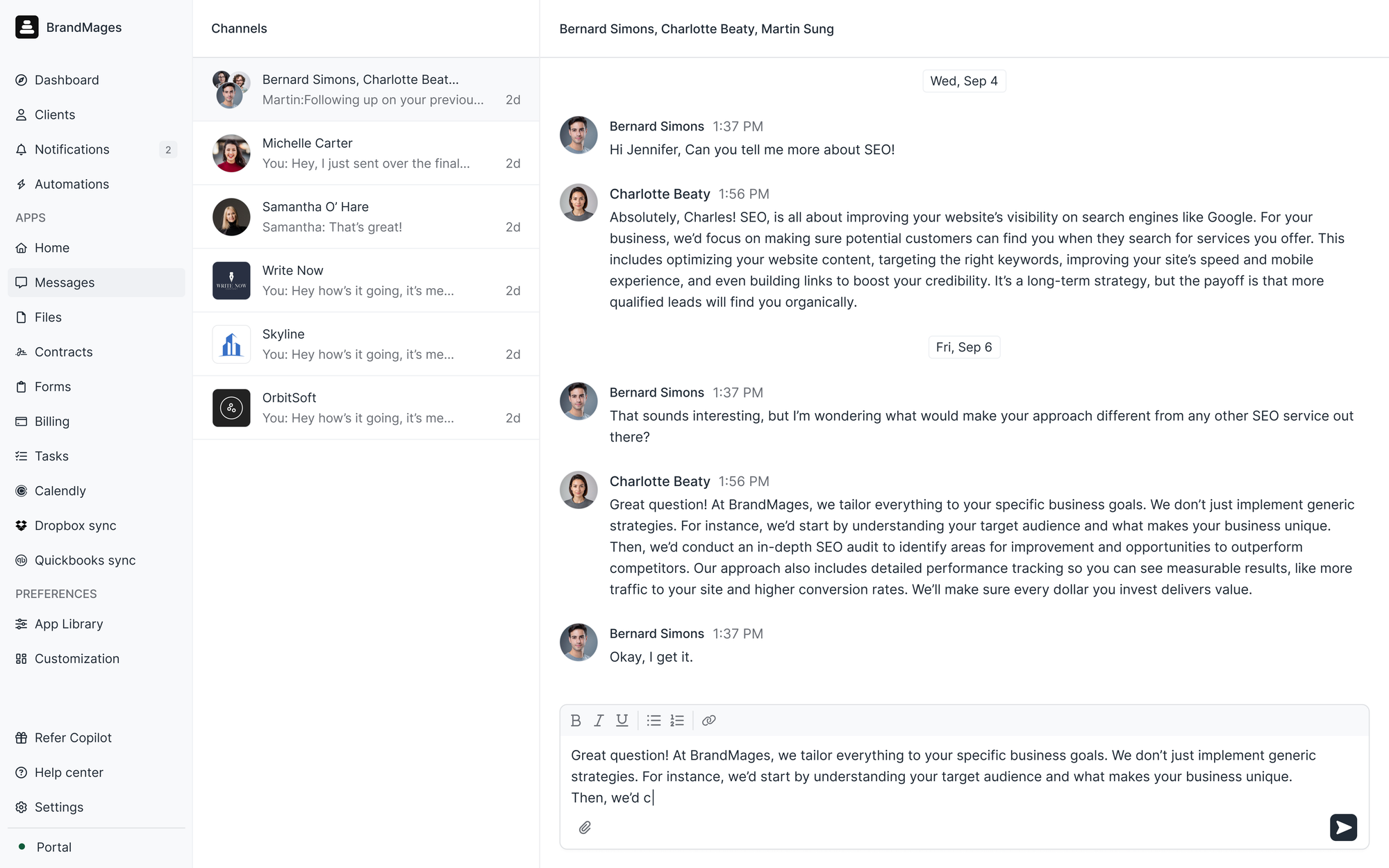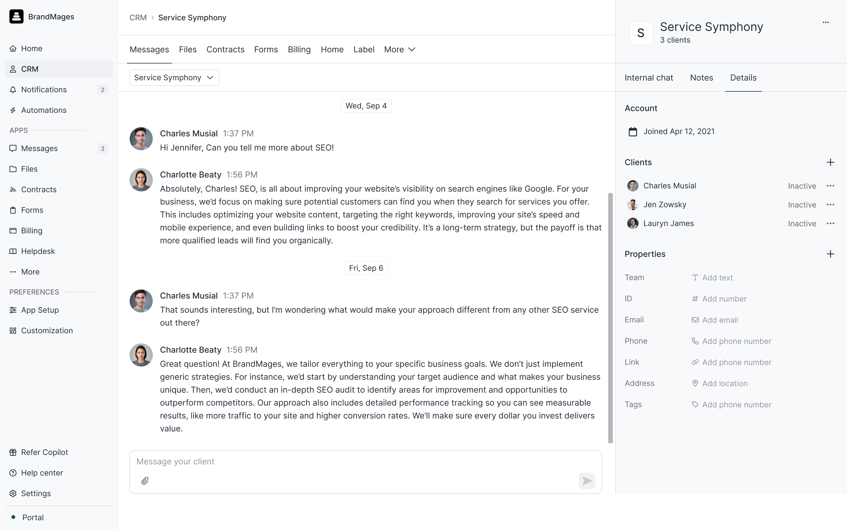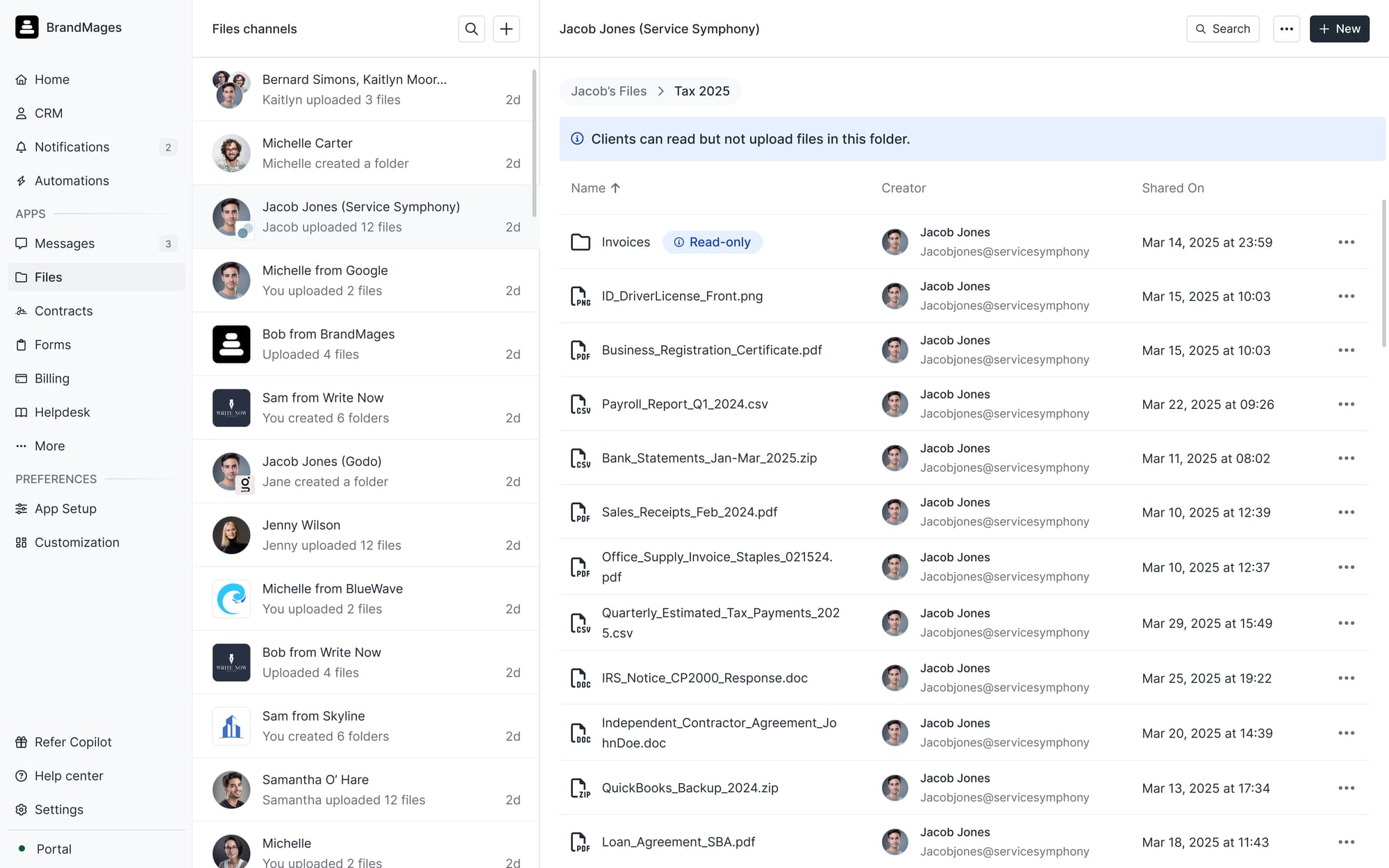 We've redesigned the right sidebar on your client details in the CRM —and brought it to more surfaces. Now when you're in Messages, Files, Notifications, or other apps looking at client-specific content, you can pull up the context bar to see client details, edit custom fields, add internal notes, or chat with your team—without navigating away. The goal: show you the right context at the moment you need it, so you're not constantly clicking back to the CRM.