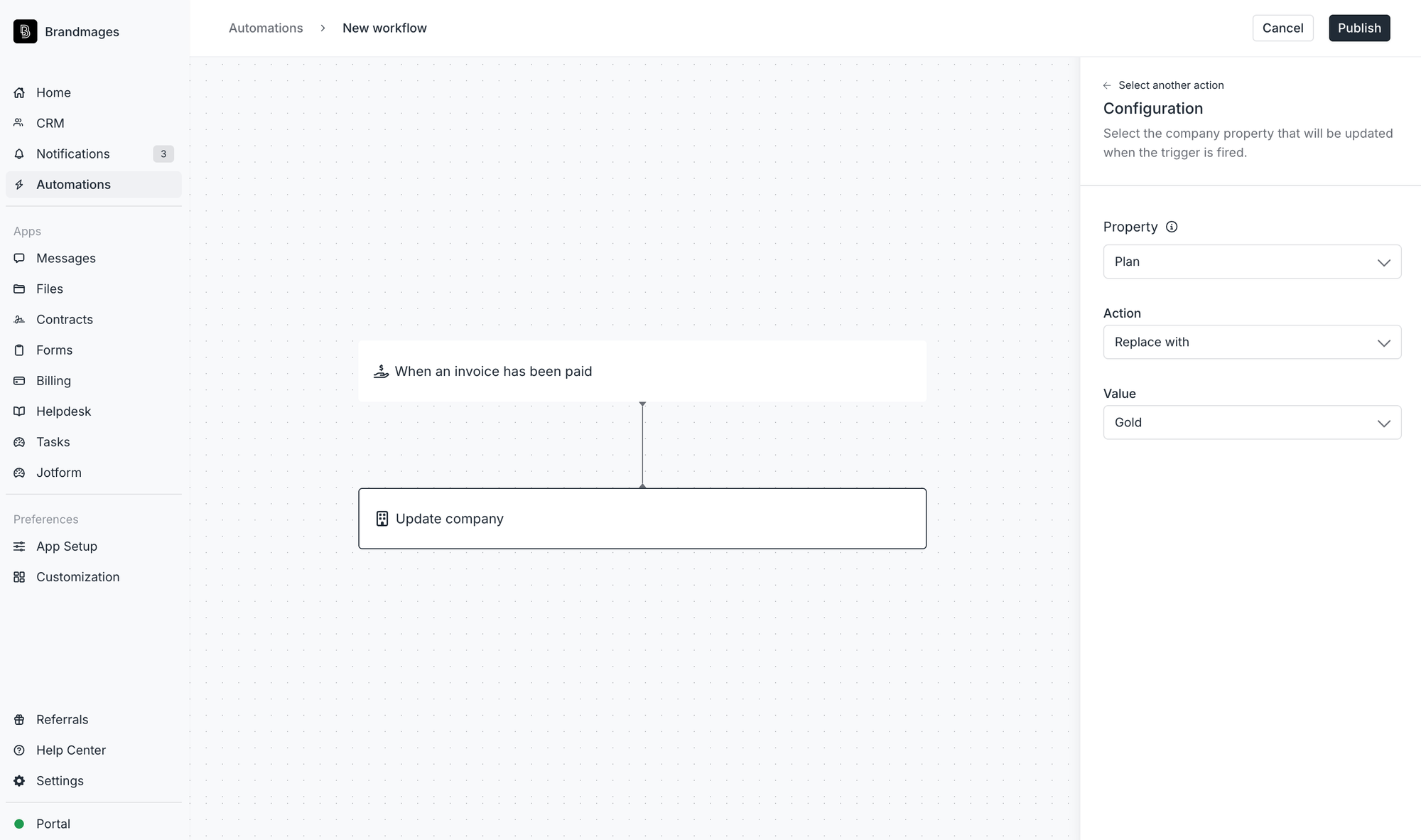 - When a customer pays for a Gold tier membership (via invoice, Store purchase, or payment link) → Update company custom field property “Plan” to “Gold.”