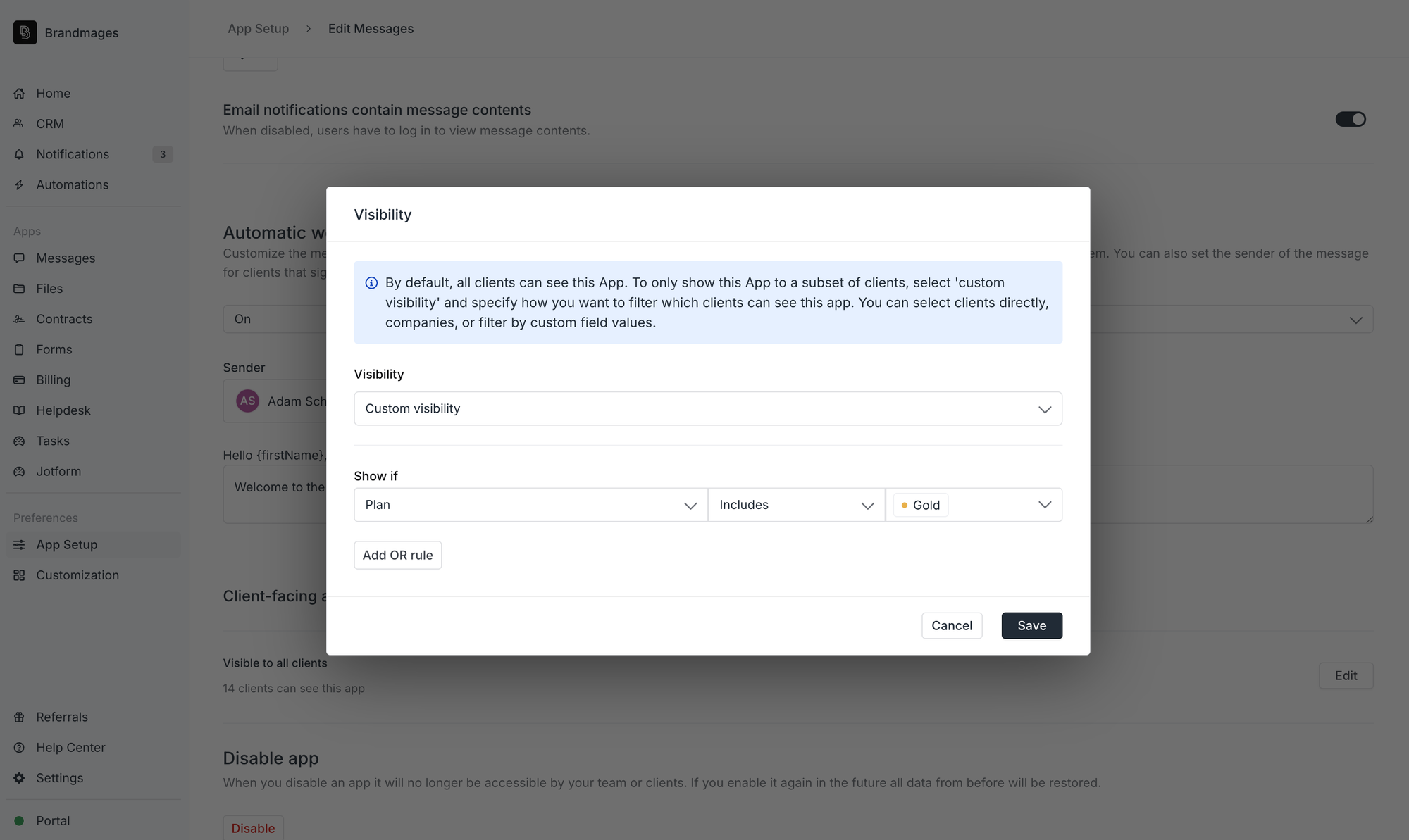 - You set the Messages App’s visibility show only to companies where their Plan tag is “Gold.”