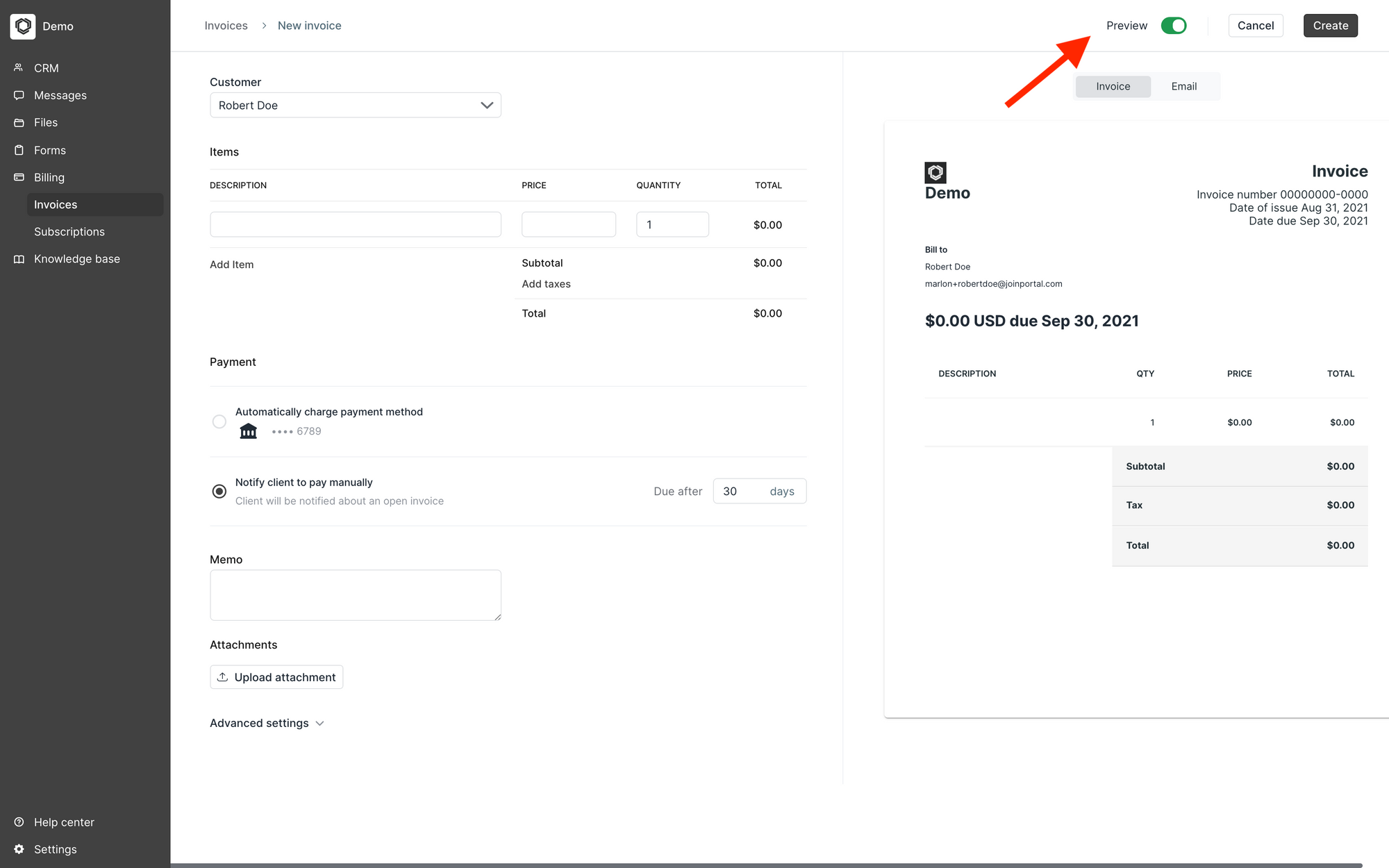 We understand that making the checkout experience as seamless as possible for your clients is really important. So now when you create an invoice you can toggle a Preview button to see a live preview of what the email notification and invoice will look like for your client.