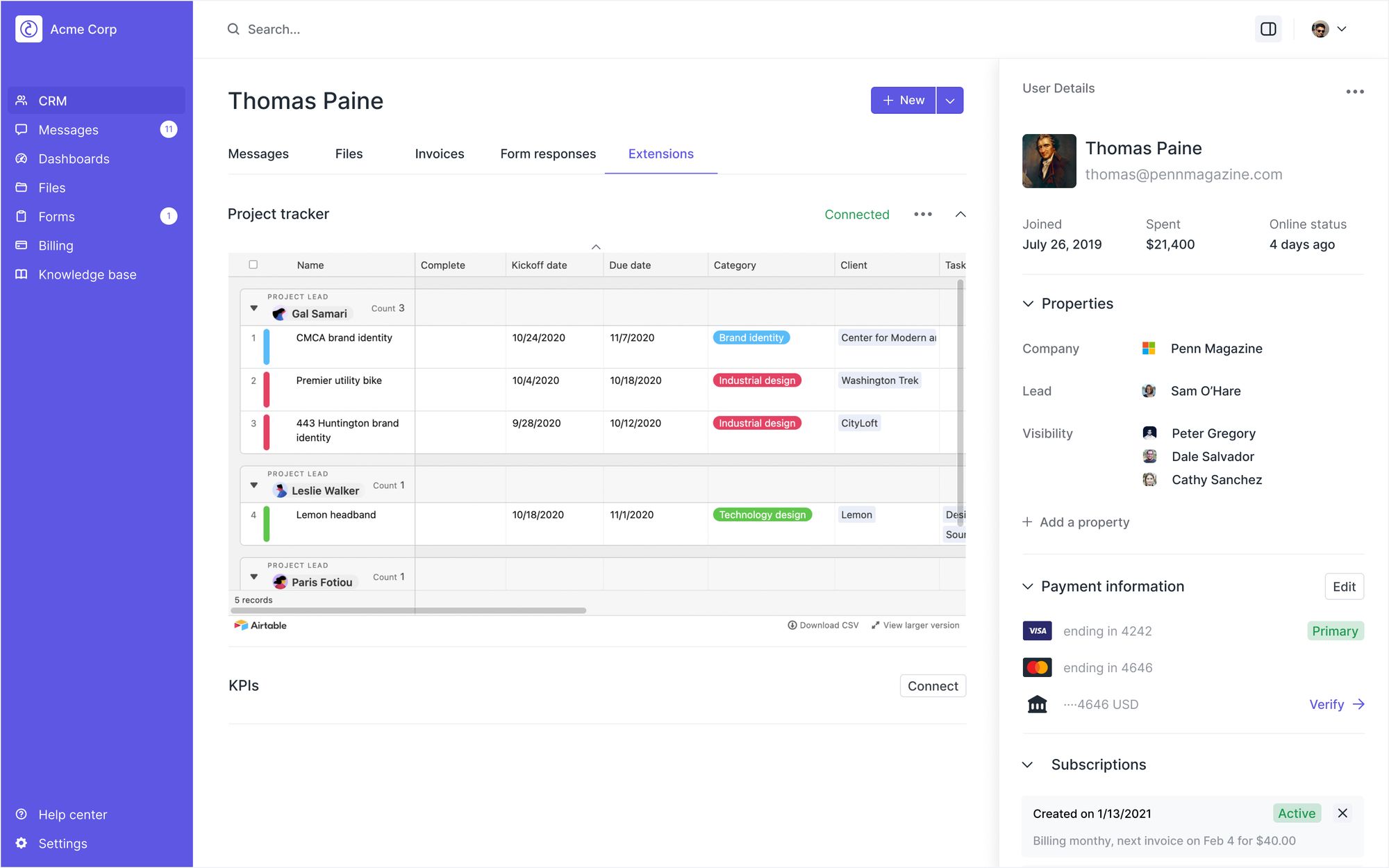 Tags make it easy to keep your clients organized and save you from entering the same text again and again. When you add a tags custom field, you can create one or more options (and color-code them) and then easily select those options on a dropdown. You can update tags on the client details page or directly on the CRM table.