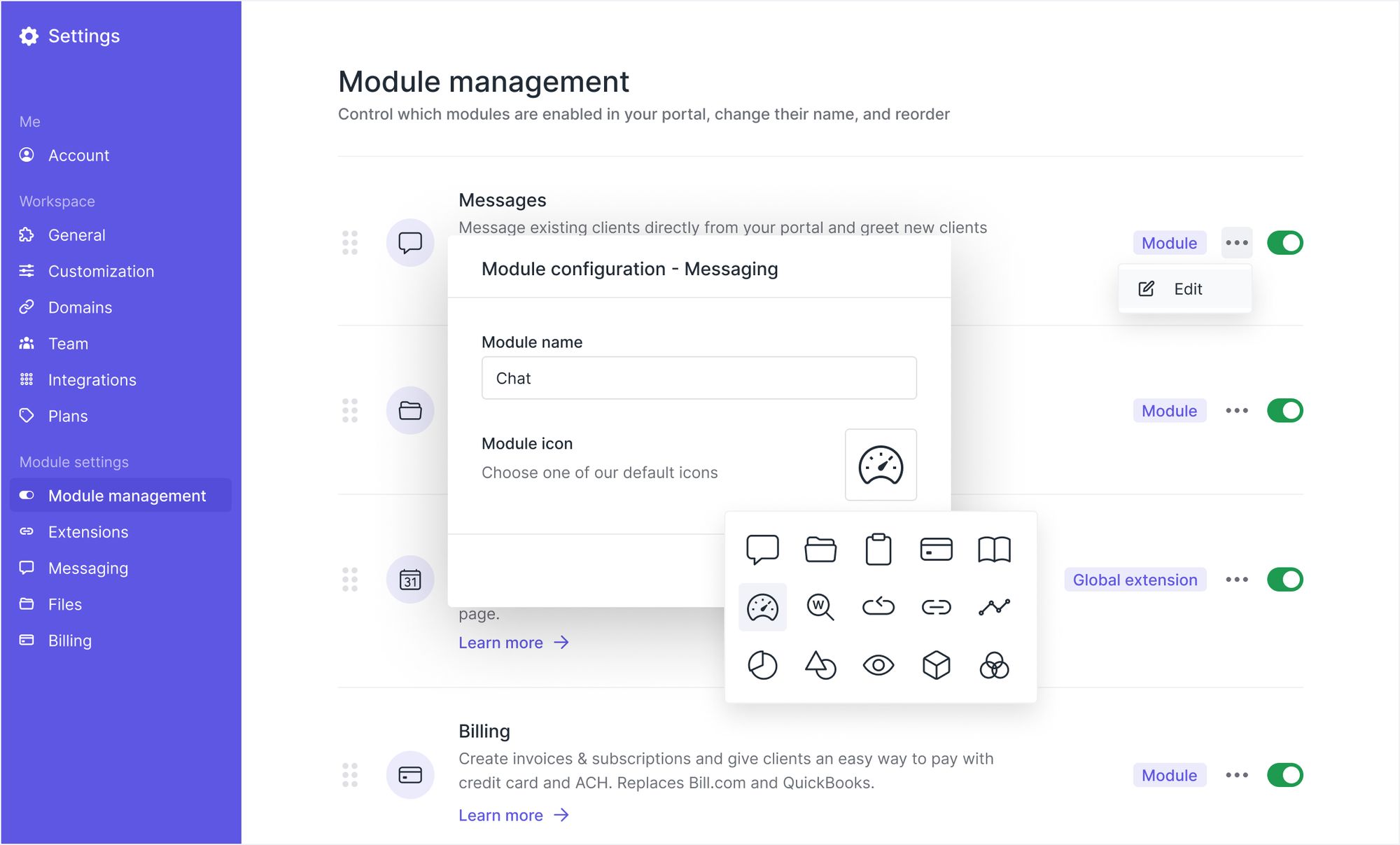 You can now assign custom names and icons to Portal Modules. Simply go to the Module management page, click Edit on a module, and there you can assign any custom name. We've also added 5 new icons to choose from.
