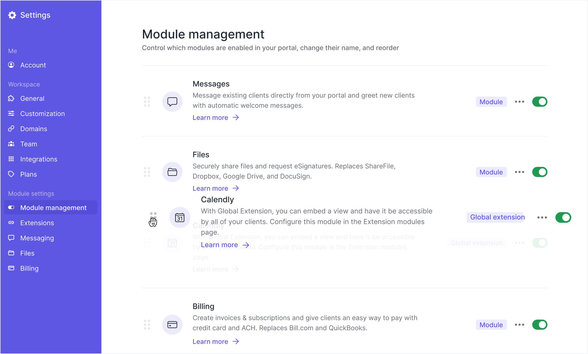 We've updated the Module management page to show Modules and Extensions on a single page. With all sidebar sections on one page, you can now reorder the Extensions and Modules by dragging and dropping them. The item at the top is automatically set to the default page that clients see when they log in. This update opens the door for creative new ways to customize your portal– for example you can connect a doc as a Global Extension, call it "Home", move it to the top to make it the default tab, and then create a fully-customizable home screen.