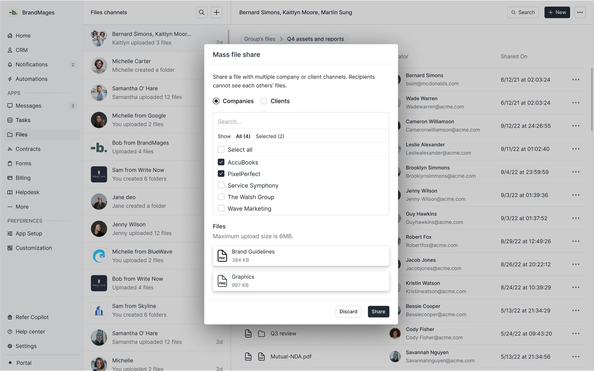 You can now mass share files with clients or companies — handy for sending monthly reports or documents. We also updated mass messaging to use the same improved UI which supports search.
