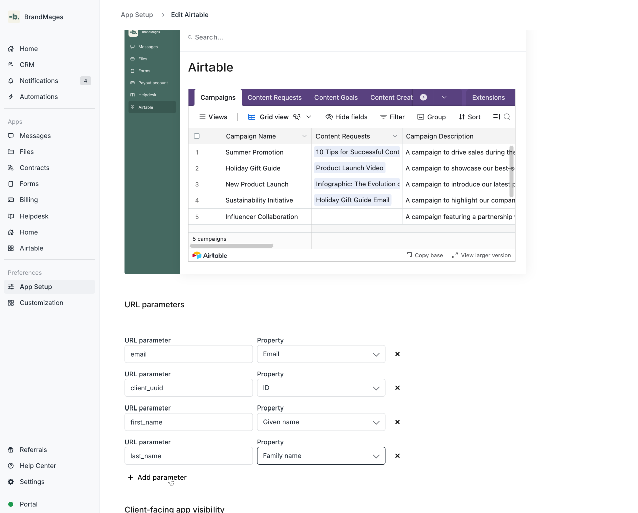 You can already embed apps like Airtable, JotForm, and Typeform. The challenge? Embedded apps couldn’t identify the client viewing them, making it impossible to pre-fill details like name, email, or company. That changes today — now, you can configure URL parameters for embeds, passing native properties and custom fields to personalize each client’s experience.