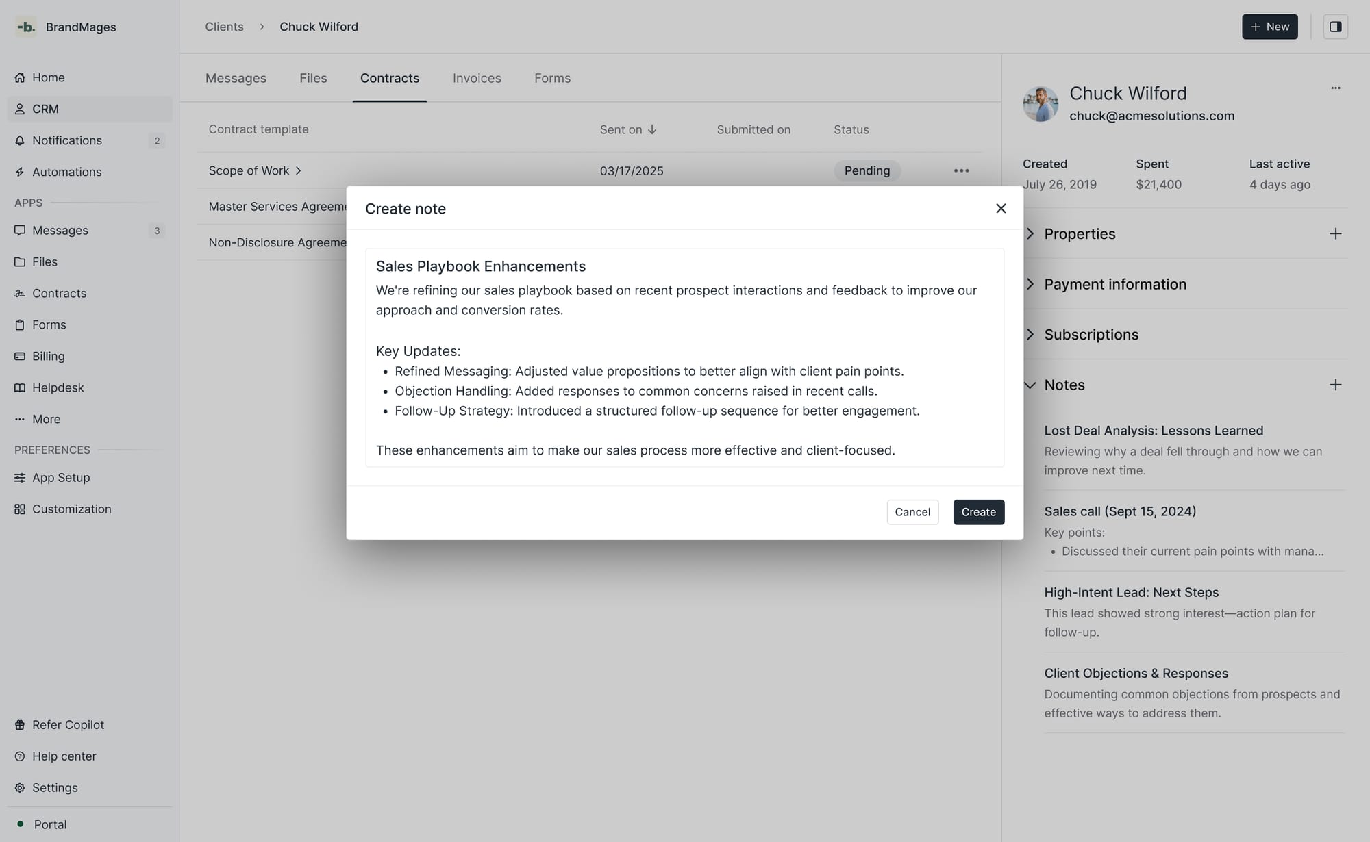 You can now add notes to clients and companies. Internal notes are visible only to you and other internal users with access and can be edited after creation. Notes are located on the sidebar of client and company detail pages. Use the slash (/) command to add rich text formatting, including headings and more. Notes also come with full API, Zapier, and Make support.