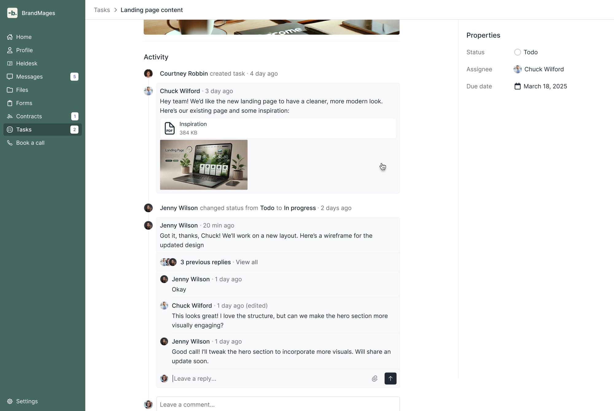 A big element of task and project management is discussion — clarifying details, answering questions, and so on. Task comments now support replies. Replies work as expected, with some extra touches like collapsing long discussion threads by default. In comments we also added support for images and attachments so that users can provide all the details needed when discussing a task.