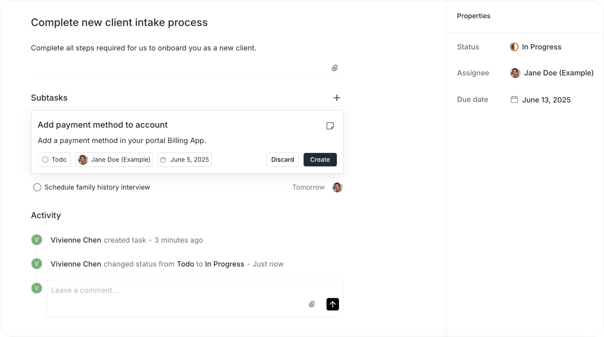 - The activity feed logs task creation, reassignment, status changes, due dates, title updates, and archiving/unarchiving.