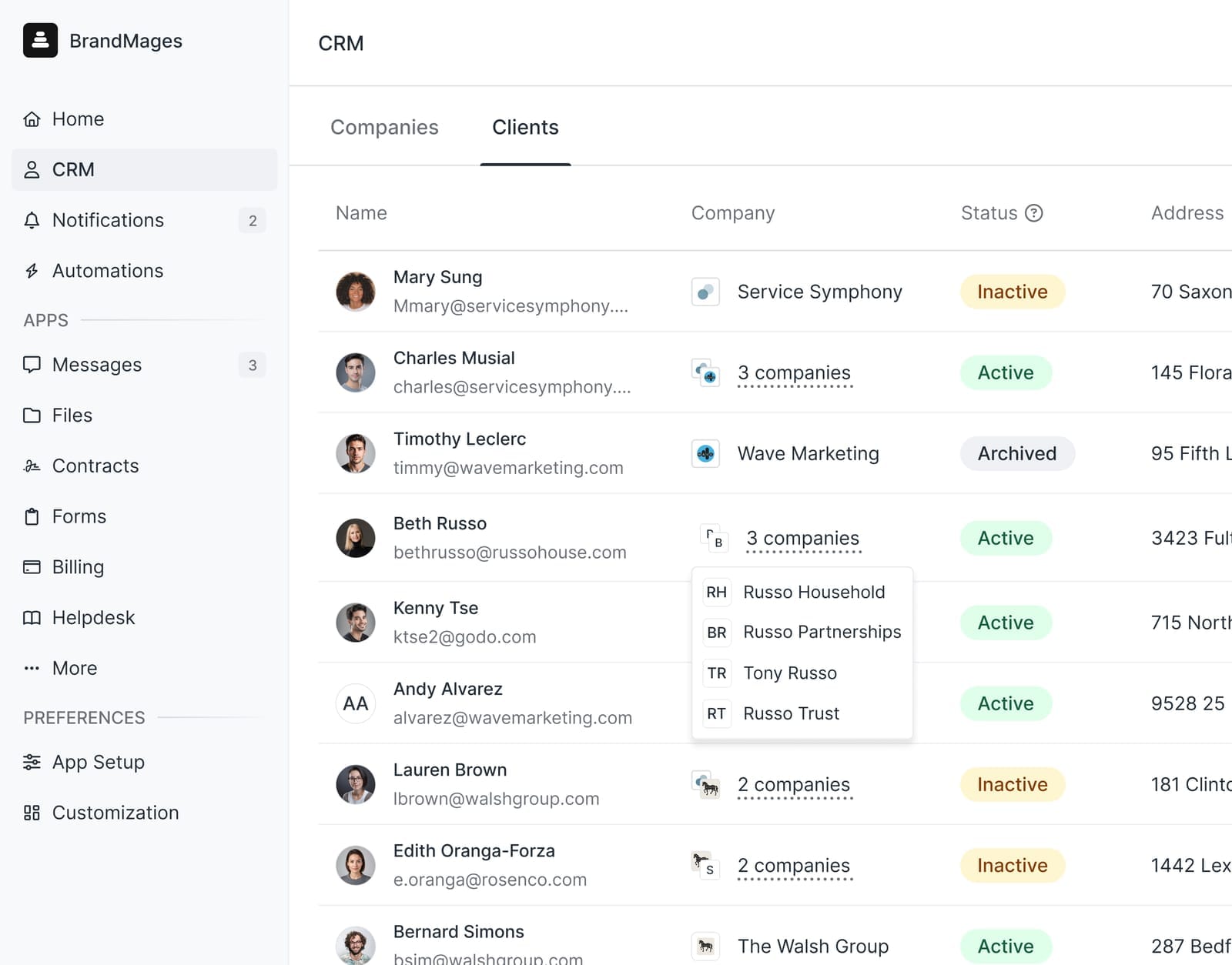 Clicking on a company takes you to a details page that shows all messages, files, etc. tied to that company. If there’s no company-specific data, you’ll see relevant data from associated clients (with a dropdown to pick which one).