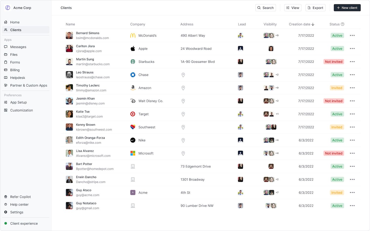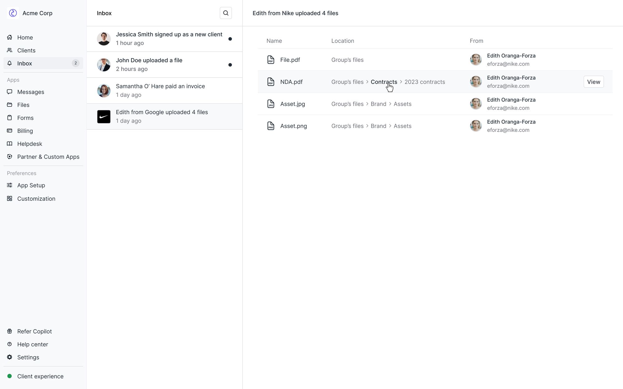 Notification center is a feature for internal users that acts as a unified place to see notifications triggered by clients. By giving notifications a dedicated page you can, (1) see more information about each notification like seeing exactly what folders new files have been uploaded in, (2) see a historical log of client activity, and (3) search/browse notifications. Note that this is our first Copilot Launchpad feature and you need to request access.