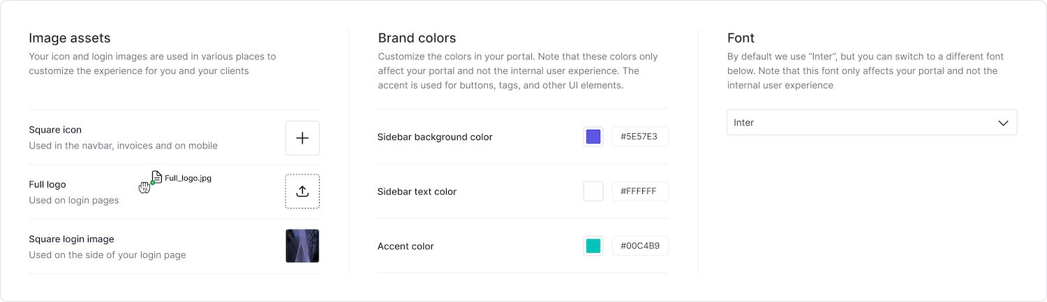- Logo and icon customization. In addition to supporting square icons, you can now upload a full logo. This full-size logo is automatically be used on your portal sign-in page as well as on invoices.