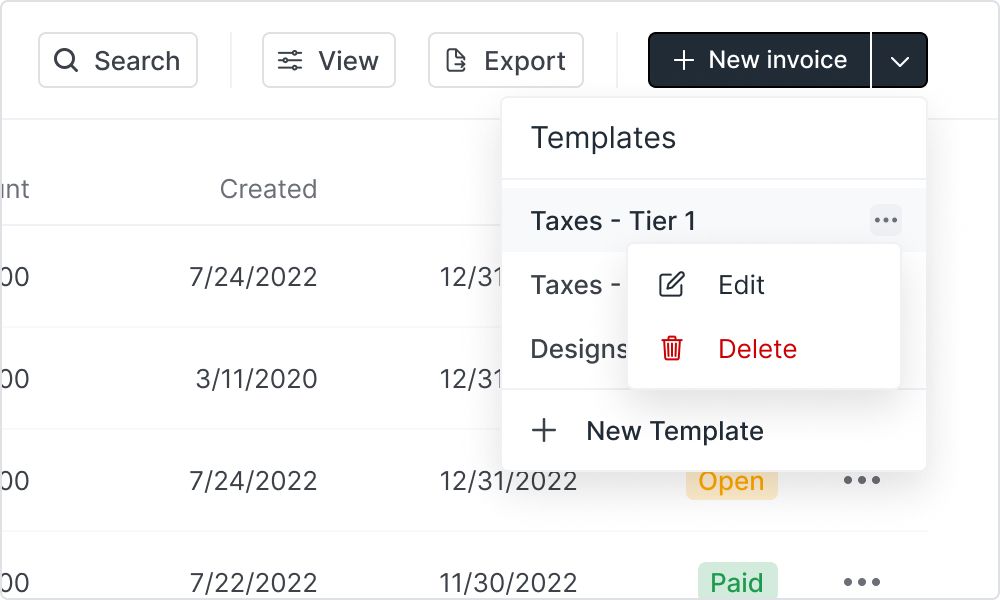 You can now create, edit, and delete invoice and subscription templates. To create a new template go to the invoices or subscriptions page and click on the dropdown. There you can see existing templates or click the + button to create a new one. When you hover over an existing template and click on the ⋯ button, you will see actions that let you edit and delete the template.