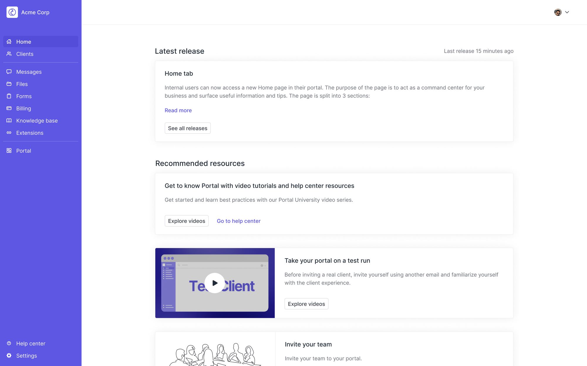 In addition to the Home tab at the top, you'll also see a few other updates to the internal user sidebar. The client experience remains the same.