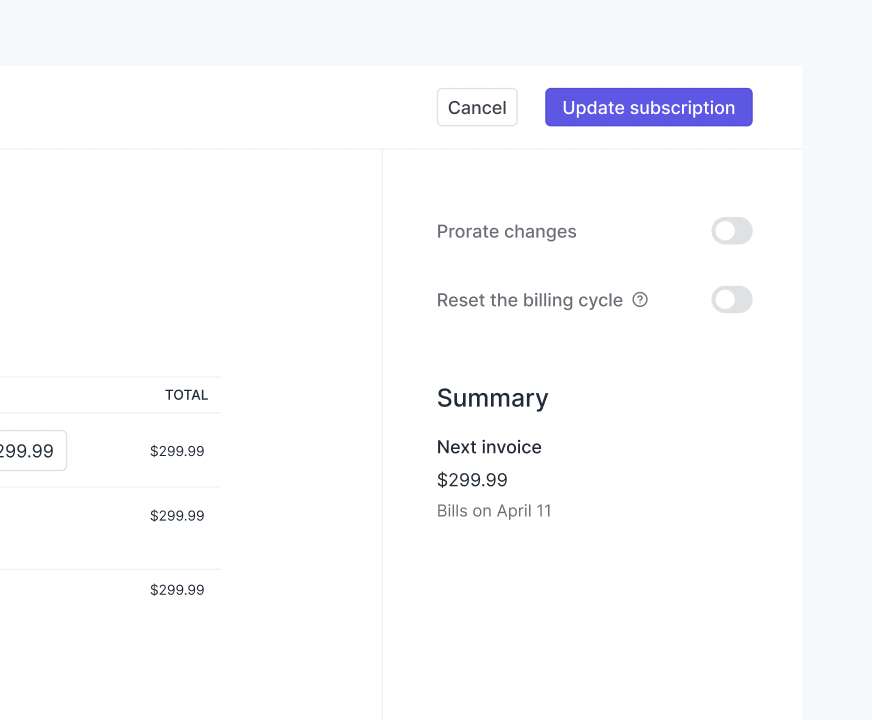When you edit an active subscription, you can now take 2 additional actions using the right-sidebar. The first lets you prorate changes and the second lets you reset the billing cycle. You can also see a preview of the next invoice, including the amount and date.
