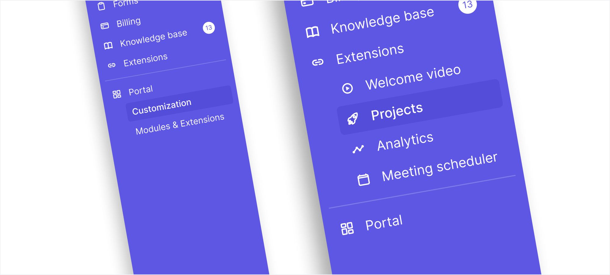- We've moved some of the items that were previously in your settings and moved them to the main sidebar. If you click on Portal you'll see that this section expands to show you the Customizations and the Modules and Extensions pages.