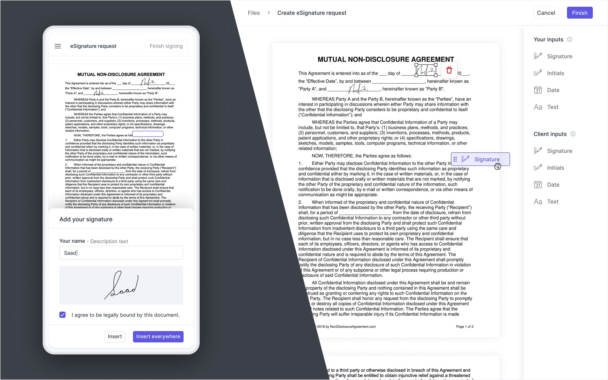 We rebuilt the eSignatures feature from scratch. With the latest release client users can complete eSignature requests from their mobile device. And internal users now have control over the size of blocks that they add. We've also made various other improvements to make the request and signing experience more intuitive and faster.