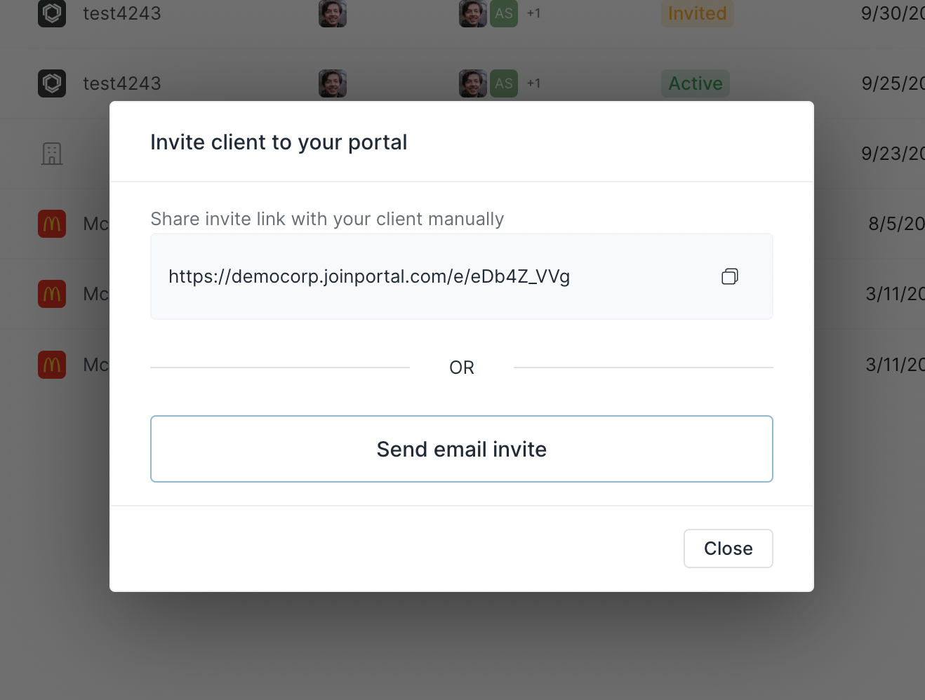 We improved the experience of adding and inviting new clients. After you create a client you will now see the modal below, which makes copying and manually sharing the client invite link the primary action. We made this changes because we learned that most people prefer to invite clients by sharing the invite link in an existing email or text conversation. If you prefer the old flow, you can still use automatic email invites by clicking on Send email invite.