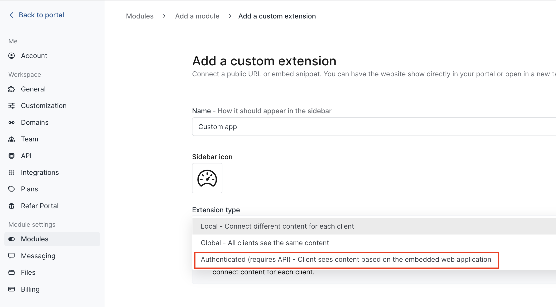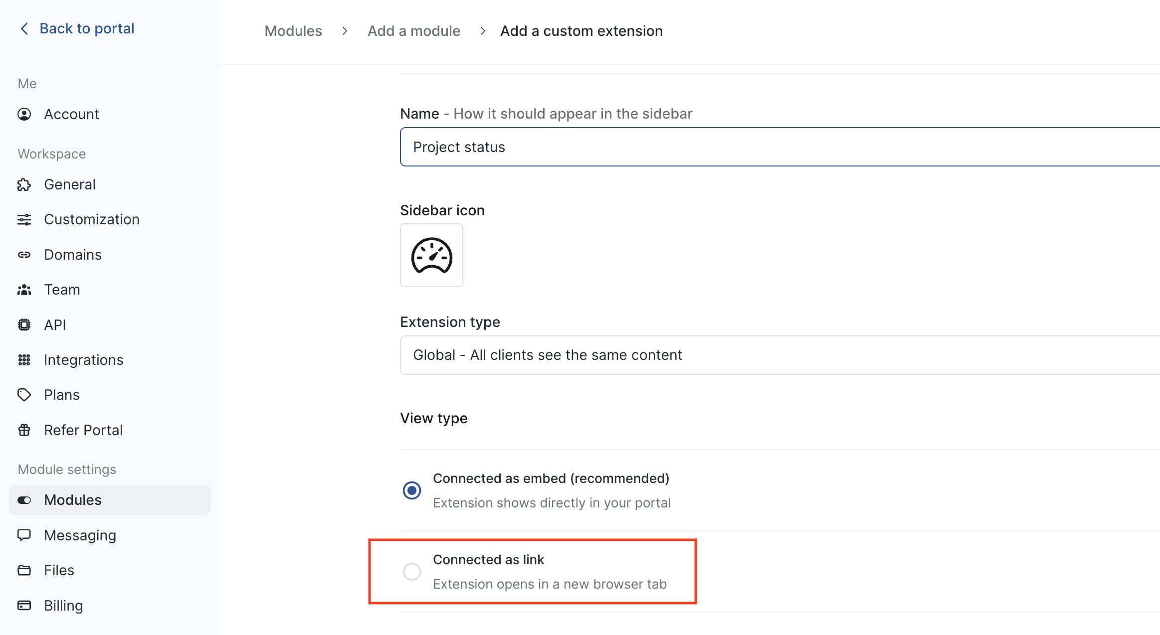 When you add an Extension you can now select the option "Opens in new tab". From the client's perspective, when they click on an Extension in the sidebar that is set up this way, rather than showing an embedded iFrame directly in your portal they will now see a new tab open in their browser. This is useful in many situations: